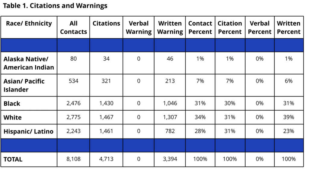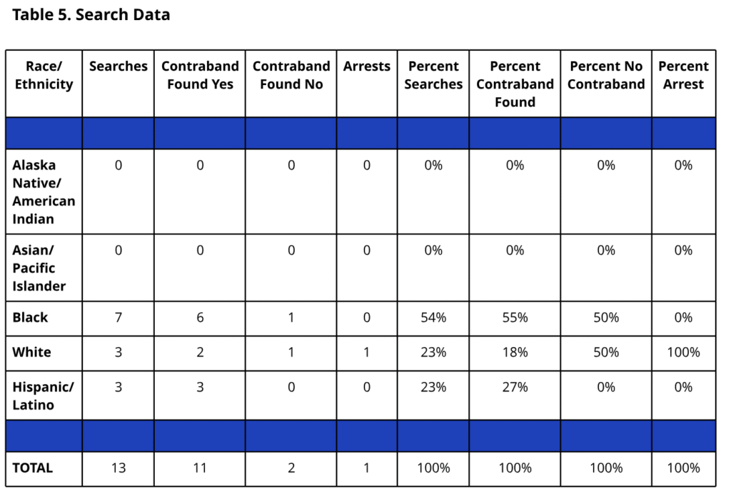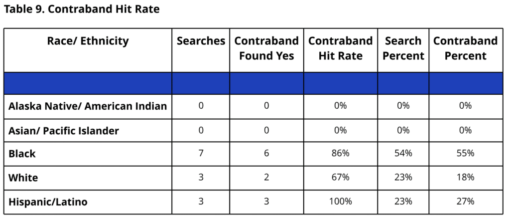The report is helpful, but the statistics are reported a bit strangely. For example, 6 out of 7 (86%) searches of black drivers and 2 out of 3 (67%) searches of white drivers resulted in contraband being found, but the “Percent Contraband Found” columns are reported as 55% and 18%, respectively. This is because the report takes the 6 and 2 instances where contraband was found and divides them by the 11 total instances where contraband was found.